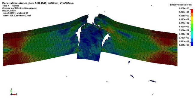 Figures 10-14 show the field of distribution of the von Misses equivalent stress for model 2. For this case, the impact projectile velocity was 500 m/s, the armor plate thickness 23 mm, and the simulation time 0.2 ms.