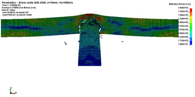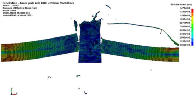 As it can be seen from the previous figures, for the case when the thickness of the armor plate is 10 mm, the penetration of the projectile occurs.