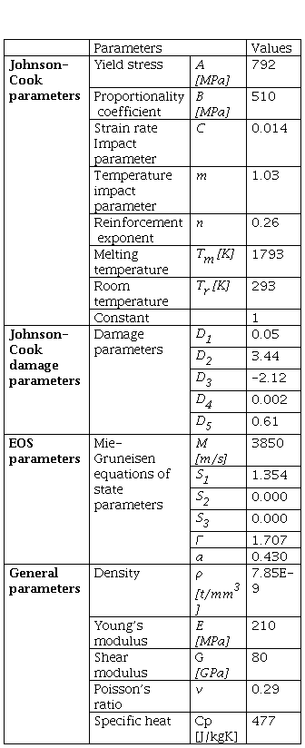 AISI 4340 steel material characteristics were used for the armor plate and are shown in Table 3, while the projectile material characteristics were the ones from a copper alloy and are shown in Table 2.