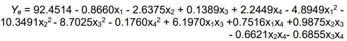 Ye gets its optimal Yeopt = 93.43% at x1 = 5.755 mgml−1, x2 = 1.0275 mgml−1, x3 = 1: 4.9, and x4 = 1.302 h.