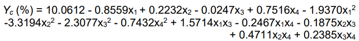 Yc gets its optimal Ycopt = 10.40% at x1 = 5.755 mgml−1, x2 = 1.0275 mgml−1, x3 = 1: 4.9, and x4 = 1.302 h.