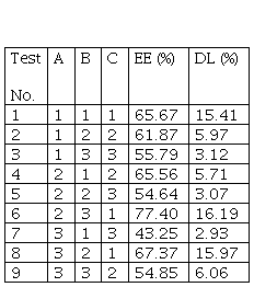 Zhu et al (2022) conducted optimizing glycerosome formulations via an orthogonal experimental design to enhance transdermal triptolide delivery. The entrapment efficiency (EE) of the nanocarriers and the drug loading (DL) are taken as evaluated attribute indexes. The glycerol concentration (A, %), the phospholipid to cholesterol mass ratio (B, m/m) and the phospholipid to triptolide mass ratio (C, m/m) were set as independent variables with three levels of A (10, 20, 30 %), B (10:1, 20:1, 30:1 m/m) and C (5:1, 15:1, 30:1 m/m). Thereafter, the three-level orthogonal table [L9(34)] was employed in the study.