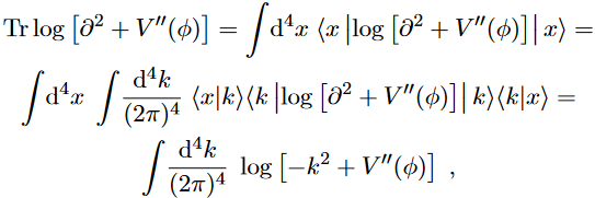 It is clear that in general it is not possible to obtain a closed form for the eigenvalues of the operator in eq. (85). We need to introduce some simplifications: the configurations we will study will be the ones for which φ is independent of x. In this case, V′′(φ) becomes a constant related to a mass, μ(φ)2. The operator ∂2+V′′(φ) becomes translationally invariant and is easily evaluable going to momentum space. After obtaining thee igenvalues of the operator, we have to calculate the logarithm and sum over for trace. Therefore