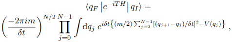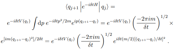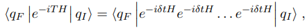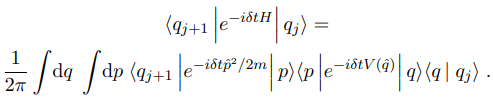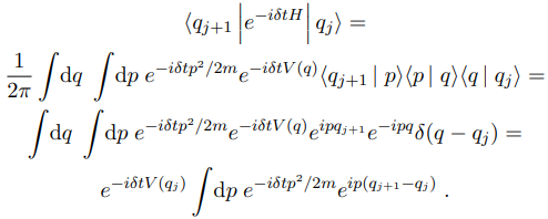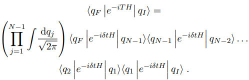 the term e−iδtH being repeated N times. Now use the fact that |q⟩ is a complete set of states, that is, and insert 1 between every exponential factor exp(−iδtH):
