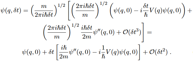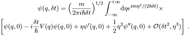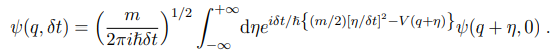 Our next step is to derive the Schrödinger equation by means of path integral formalism. Since it is a differential equation we need only to find out the infinitesimal evolution of the wave function in time and space. Setting the initial conditions as tI = 0, qI = q′ , tF = t, qF = q; δt = t and η = q′ − q are infinitesimal. The time and space evolution for the wave equation from the point (0, q′ ) to the point (q, t) is given by