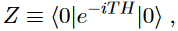Almost always initial and final states are the same, that is, the ground state |0⟩. The amplitude ⟨0|e−iTH|0⟩ is denoted by Z,