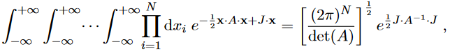 where x·A·x=xiAij xj and J·x=Jijxj , with repeated indices summed over. To prove eq. (38), diagonalise A by an orthogonal transformation O : A = O−1 · D · O, where D is a diagonal matrix with elements given by all eigenvalues of A. This operation is always possible because A is a definite positive matrix, otherwise the integral would not converge. Define a new variable y=O·x, that is, yi=Oijxj , then the exponential will reduce to a sum of squares: