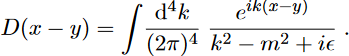 because, since we are dealing with the continuum, Kronecker’s delta δij for the definition of inverse operators have to be replaced by Dirac’s delta functions δ(4)(x − y). The resulting function D is the well–known free propagator for a scalar relativistic particle of the mass m, here written as a less familiar function of the coordinates x instead of its more popular Fourier transform