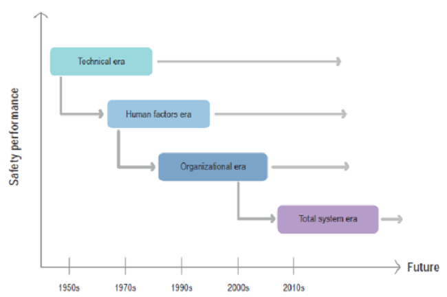 The periods of the development of flight safety systems are shown in Figure 1, (International civil aviation organization- ICAO, 2018). Until 1970, the main cause of plane accidents was a technical factor. With the improvement of the production technology and the reliability of the aircraft, the period of influence of the human factor in the servicing and maintenance of the aircraft as a primary factor affecting flight safety begins. In the mid-1990s, the causes of flight organization as a cause of aviation accidents were investigated in order to introduce the term total flight safety at the beginning of the 21st century through the management of a flight safety system that combines technical, human, organizational and safety factors into a single system.