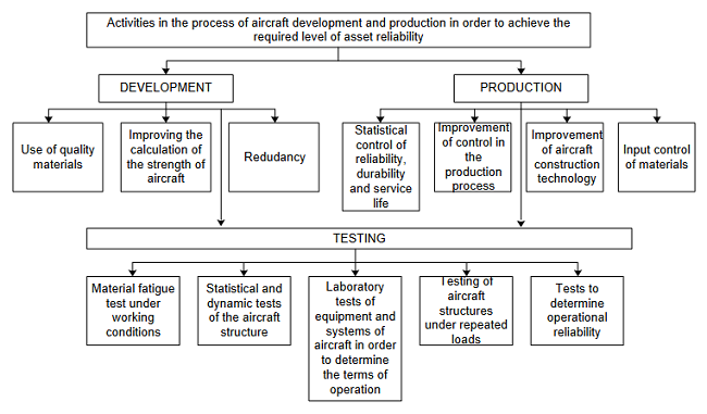 The aircraft reliability depends on the scope and depth of aircraft research and testing in the design and development phase. During the design process, the basics of the reliability of each aircraft, their construction strength and material fatigue, service life, and convenience for maintenance are defined. In the same phase, problems of functional efficiency are solved as well as problems of technological, repair and exploitation indicators.