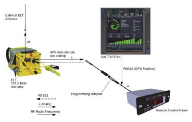 Most modern aircraft are equipped with devices for broadcasting the GPS position of the aircraft Emergency Locator Transmitter (ELT), in order to quickly find an aircraft that has suffered an accident or forced landing. Figure 4 (Airbus Helicopters, 2016) shows the configuration of one set of ELT devices, consisting of special modules with the antenna part and the power supply, a pointer and a control module.