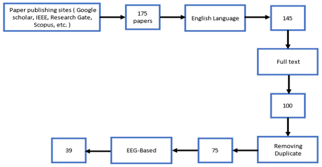 An extensive literature search was carried out. The search covered studies between 2011 and 2018. Only full-text papers published in English were considered. In this research, the combination of keywords (BCI or Brain-Computer Interface or EEG or Electroencephalography) and (Prosthetic Limb, Prosthetic Arms or Robot) and ( Control Method ) is used. Figure 2 shows the process of how the chosen papers were selected in this research.