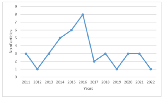 Figure 3 shows the distributions of the articles regarding the EEG-Based Control method for artificial upper limbs (as prosthetic arms or assistive devices or robotic arms). Years from 2013 till mid of 2016 witnessed a rise in research interest in this area.
