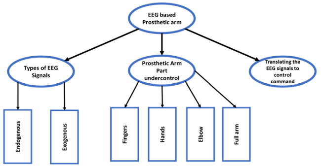The solutions to these questions will guide the reader and enhance their knowledge of the recent development of prosthetic arms based on EEG signals. A more extensive image of various emergent topics/themes, experiments, and concepts will be offered. This paper is structured into six sections.