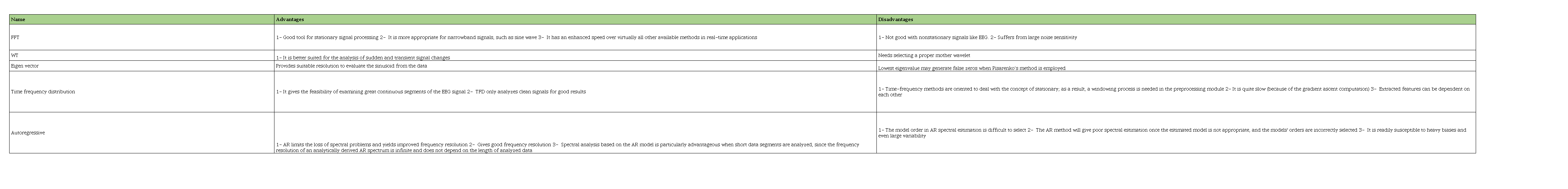Relevant features are extracted by methods such as Fast Fourier Transform (FFT), Wavelet Transform (WT), and Eigenvectors (Zhang et al, 2008). There are different methods for feature extraction of the signal such as FFT, WT, Eigenvectors, Time-frequency Distributions, and Autoregressive Method. Table 6 shows every method mentioned earlier with their advantages and disadvantages.