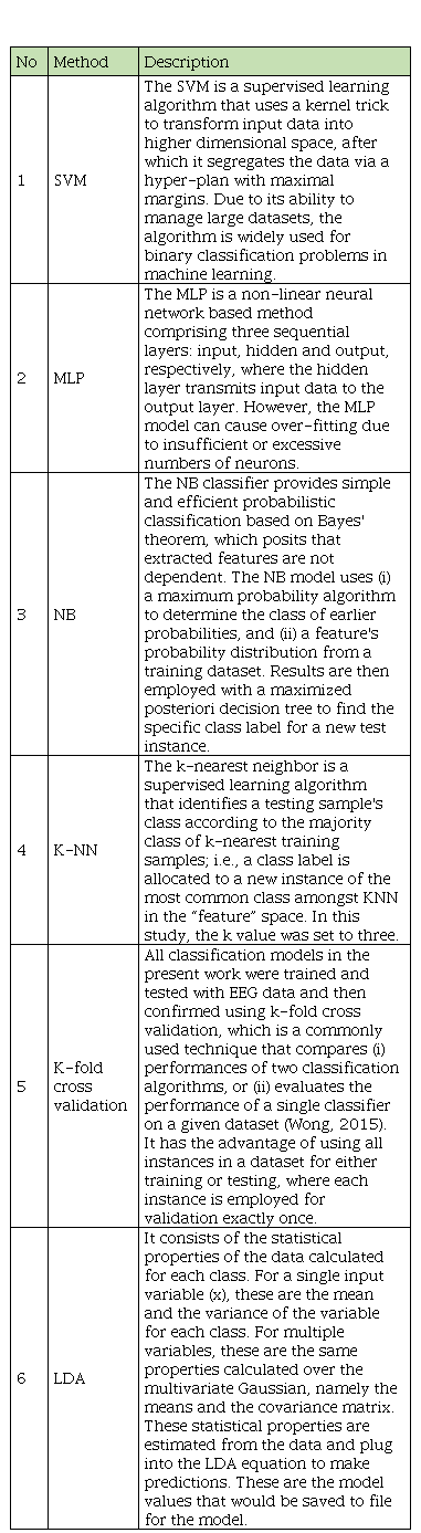 A classifier utilizes values for independent variables (features) as inputs to predict the corresponding class to which an independent variable belongs. A classifier has a number of parameters that require training from a training dataset (Wen et al, 2021). A trained classifier will model the association between classes and corresponding features and is capable of identifying new instances in an unseen testing dataset. Several techniques of classification are explained in Table 7.