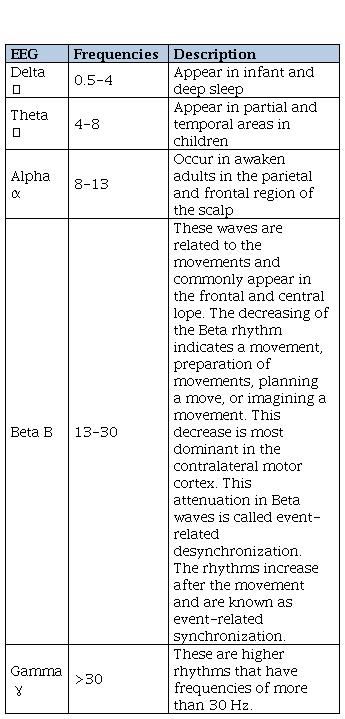 In EEG measurement, detected waveforms reveal cortical electrical activity. The signal intensity of EEG activity is often quite small and measured in the microvolt (μV) range (Übeyli, 2009; Acharya et al, 2019). The main EEG rhythms are classified based on the frequency range as alpha (α), beta (β), delta (δ), theta (θ) and gamma as shown in Table 1a.