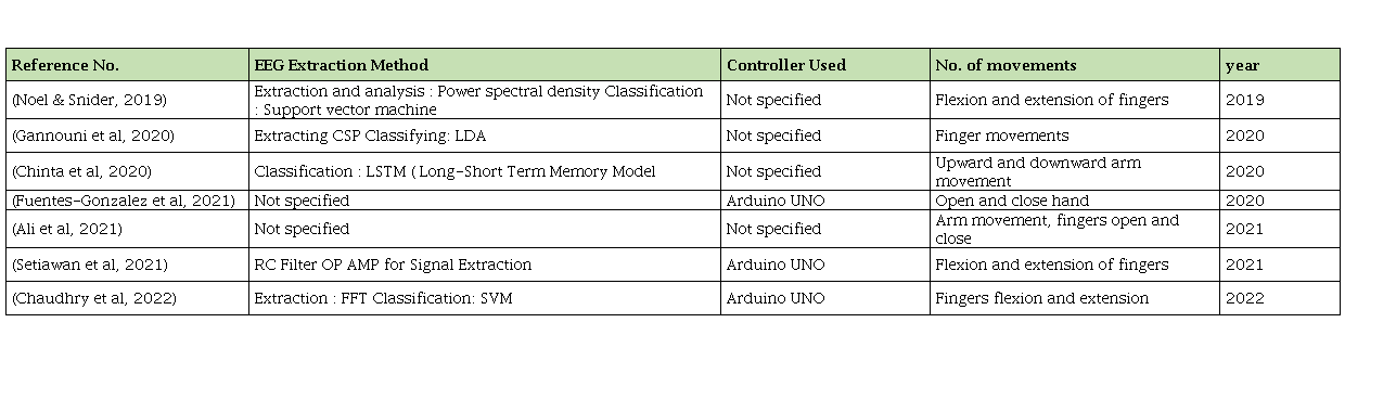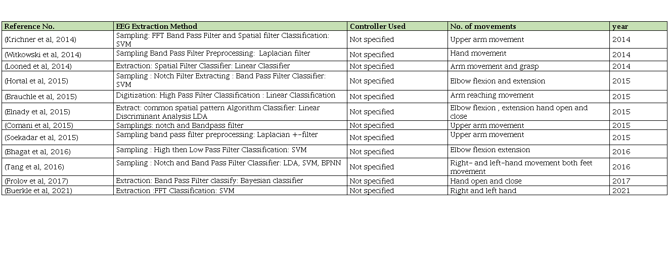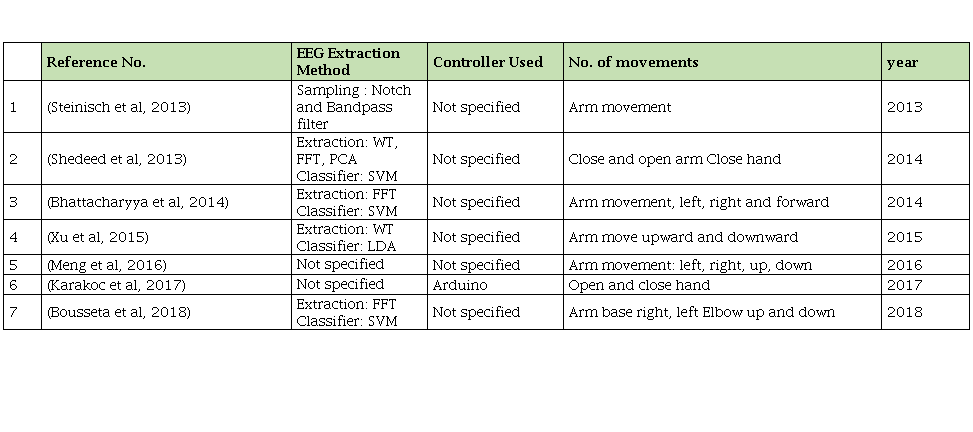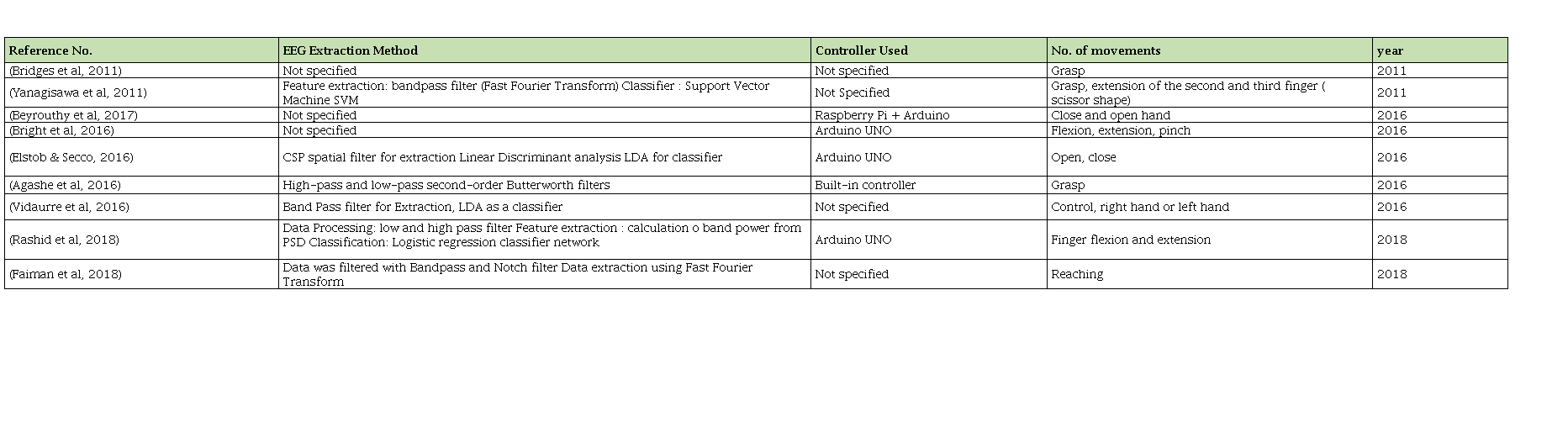 In the BCI system, EEG signals are most commonly used not only for prosthetics but also for any controllable devices such as robotics arms, Exoskeletons, Wheelchairs, drones, etc. Bridges et al. (Bridges et al, 2011) and his team provide an overviewof human-machine interface architecture. The article contains good information about the control system. Yanagisawa et al. (Yanagisawa et al, 2011) shows a new method of controlling a prosthetic arm using ECoG signals. The system proved its effectiveness in decoding the hand movement of a patient who suffered from a stroke and used that signal to control a prosthetic hand. Another research implemented by Taha and his team (Beyrouthy et al, 2017) is about a system that extracts the EEG signals from the brain and uses them to control a smart 3D prosthetic arm. The system showed great results and presented a reliable alternative for an invasive system. Researchers in (Bright et al, 2016) succeeded in developing an EEG-based brain control system for the prosthetic arm using a BCI Neurosky mind wave set. The system reached an accuracy of 80 %. The team of researchers in (Elstob& Secco, 2016) controlled a 5 DOF robotic and prosthetic hand. They used two software frameworks. The method showed good results both technically and economically. A study of experimenting how transradial amputees could control grasp preshaping in a prosthetic arm using an EEG-based closed Loop BMI system is done by Agashe et al. (Agashe et al, 2016). The results showed that the EEG-based BMI system is a feasible solution. Healthy participants involved in a study implemented by Vidaurre et al. (Vidaurre et al, 2016) were able to use non-invasive Motor Imagery BCI to achieve linear control of an Upper Limb FES controlled Neuro Prosthesis. An embedded system was designed by (Rashid et al, 2018) in order to control the finger movement of the prosthetic arm using EEG signals. The signal classification accuracy of this study reached an acceptable percent of 79 %. Faiman et al. (Faiman et al, 2018) investigated whether spontaneous resting-state functional connectivity could predict the degree of motor adaptation of the right (dominant) upper limb reaching in response to a robot-mediated force field. Spontaneous neural activity was measured using resting-state electroencephalography (EEG) in healthy adults before a single session of motor adaptation. Noel & Snider (Noel & Snider, 2019) used the Deep Neural Network to control the prosthetic arm. The Neural Network was used to classify the signal to detect person's intention of extending the right index finger. The model achieved an accuracy of 63.3%. Gannouni et al. (Gannouni et al, 2020) presented a study that uses machine learning in order to anticipate the movement of all five fingers. The proposed system achieved a signal classification accuracy of 81%. A 62% accuracy was achieved for an inexpensive mind-controlled prosthetic arm based on EEG signals. The system was implemented by (Chinta et al, 2020). Fuentes-Gonzalez et al. (Fuentes-Gonzalez et al, 2021) designed a prosthetic arm using blender software. The control of the prosthetic arm was done using EEG signals. The prosthetic arm was fitted to a 64-year-old man who had suffered from an electric shock. Ali et al. (Ali et al, 2021) build an inexpensive smart functional prosthesis arm in accordance with functional and non-functional requirements to meet users’ goals and requirements. Setiawan et al. (Setiawan et al, 2021) designed a system to control a prosthetic hand using EEG signals to execute flexion and extension of fingers. Chaudhry et all (Chaudhry et al, 2022) discussed EEG control algorithms for prosthetic arms. They developed a cheap three-dimensional prosthetic arm;however, it was only a prototype and couldnot be applied for amputees. An EEG-based control system is not restricted to prosthetic arms only sinceexoskeleton and robotic arms can also be included in that area. Xu, et al. (Xu et al, 2011) developed a rehabilitation system for an upper limb stroke patient where the assistive device was based on motor imaginary EEG. The system proved feasibile and is fully capable of exploring patientʹs motor initiatives and guiding stroke patients to perform rehabilitation training effectively. The teams in (Ramos-Murguialday et al, 2012) developed a robotic hand exoskeleton based BCI to move fingers in flexion and extension movements. The results suggest that feedback contingency (proprioceptive stimulation paired with EEG SMR desynchronization) influences the motor network enhancing significantly SMR down-regulation. Formaggio et al. (Formaggio et al, 2013) present a study to perform a robot assisted task using a Bi-Manu track robot assisted arm trainer. Eight subjects participated in the study. The results suggest new perspectives for the assessment of patients with neurological disease. Tung et al. (Tung et al, 2013) performed a study of EEG to track the effect of a BCI based therapy on brain plasticity. The results suggest that motor recovery improvement comes from increasing activation in the lesion hemisphere during the BCI therapy. Krichner et al. (Krichner et al, 2014)carried out an experiment to prove that EEG and EMG can improve the adaptability of assistive devices in accordance with demands of users. The results show that both EEG and EMG predict a movement before it is physically executed. Witkowski et al. (Witkowski et al, 2014) introduced and tested a novel hybrid brain-neural computer interaction (BNCI) system fusing electroencephalography (EEG) and electrooculography (EOG) to enhance reliability and safety of continuous hand exoskeleton-driven grasping motions. Looned et al. (Looned et al, 2014) introduceda wearable and portable system consisting of a novel lightweight Robotic Arm Orthosis (RAO), a Functional Electrical Stimulation (FES) system, and a simple wireless Brain-Computer Interface (BCI). This system is able to process electroencephalographic (
