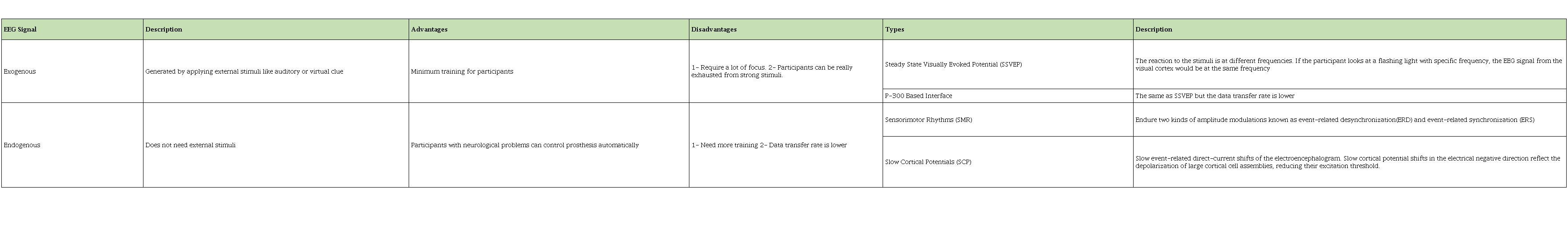 Depending on the movementtype, the prosthetic arm can be managed by utilizing exogenous or endogenous EEG signals.
