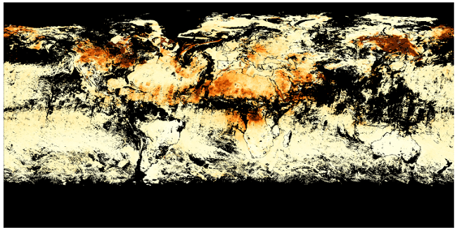 NEO data sets are available in RGB as PNG files among other formats and all files are at full NEO resolution (3600x1800 pixels). Fig. 1 shows one sample of the data set MODAL2_E_AER_OD which presents global AOT for every 8 days from the Terra/MODIS (NASA NEO Nasa Earth Observations, 2022a; NASA NEO Nasa Earth Observations, 2022b). Optical thickness of less than 0.1 (palest yellow) indicates a crystal clear sky with maximum visibility, whereas a value of 1 (reddish brown) indicates very hazy conditions.
