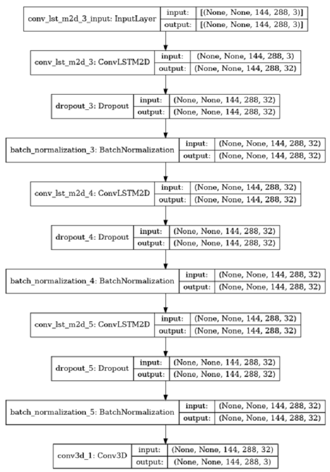 The DL model used in this study consists of 3 x ConvLSTM2D layers and the final layer Conv3D as an output. The Conv3D layer creates a convolution kernel that is convolved with the layer input to produce a tensor of outputs, i.e. height, width, and channel of the image. The ConvLSTM2D layer was followed by Dropout and BatchNormalization. In ML, early stopping is a form of regularization used to avoid overfitting and it was used in the model with a Reduce learning rate when a metric has stopped improving. The DL model is done in Keras. Keras is an open-source software library that provides a Python interface for artificial neural networks. Keras acts as an interface for the TensorFlow library.
