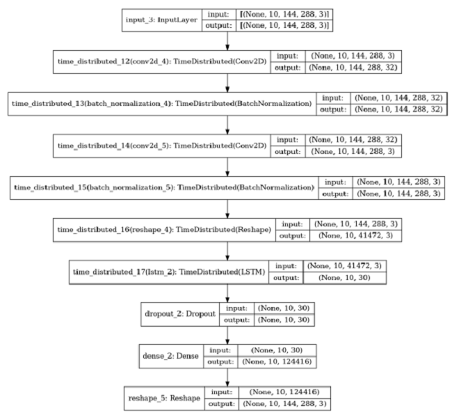 For STP, as mentioned, it is common to use CNN + LSTM models (Ding et al., 2020). To compare ConvLSTM and CNN LSTM, the new CNN LSTM model has been developed. Figure 5 depicts the new CNN LSTM model. The evaluation metrics was for MSE 0.1117 and in comparison with the ConvLSTM model (MSE 0.0116) presents a higher value. Lower values of MSE indicate a better fit.