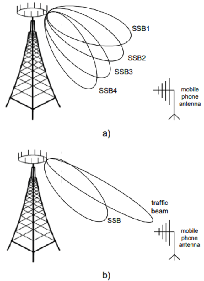 There is also another important characteristic which has to be emphasized when 5G signals are transmitted: implementation of antennas whose radiation pattern is variable (not fixed). The optimal beamforming for different signals in the 5G subframe is achieved in this way. When the SSB signal is considered, it is transmitted using several radiation beams in fixed, a priori defined directions to allow all users in the area around the base station to detect some of these signals in an adequate way. When traffic channels are the subject of analysis, a radiation beam is separately formed for each user (in a direction towards him) to allow optimal signal detection. The beams for SSB signals are considerably wide to allow for greater space to be covered by one beam. On the contrary, traffic beams are very narrow to decrease interference from other traffic channels at the receiving side as much as possible. This whole analysis is illustrated by Figure 2.