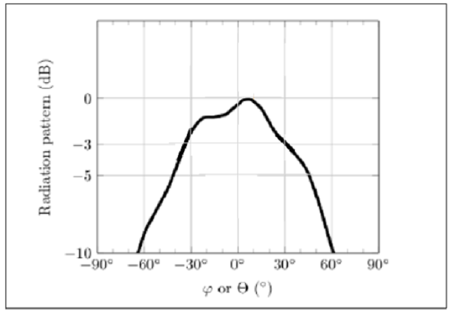 The implemented SSB beams must cover the whole area around a BS to allow all users to receive some of SSB signals. When considering the azimuth (), it is 3600 and when considering the elevation (), it is 1800. This space is in this analysis covered by only four antennas. The beams of these four antennas are directed from the BS tower down at the angle of 450 in relation to the horizontal plane. In such a case, the maximum angle between the highest radiation direction and the user position towards the BS for the nearest SSB signal is αmax≈600 (OnlineMSchool, 2023). If the radiation pattern such as the one from Figure 3 is applied, the maximum BSS signal attenuation comparing to its peak would be about 10dB (aαmax=3.16). With the maximum number of 8 beams, this angle would be even lower, but a further calculation will include the worst situation of four antennas.