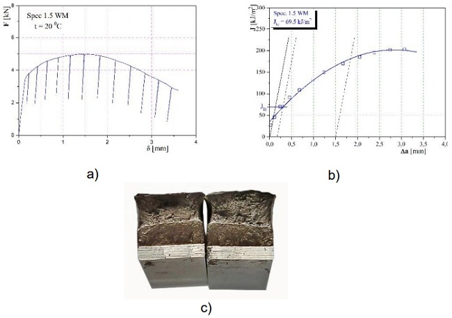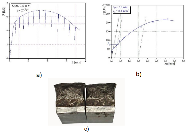 Слика 9 – (а) дијаграми F-δ, (b) J-a и (c)преломљена епрувета 2,5 са зарезом у метал шаву