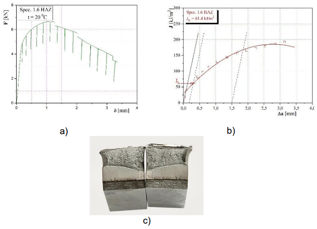 Слика 10 – (а) дијаграми F-δ , (b) J-Δa и (c)преломљена епрувета 1,6 са зарезом у ЗУТ са стране микролегираног основног материјала
