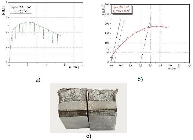 Слика 11 – (а) дијаграми F-δ, (b) J-Δa и (c)преломљена епрувета 2,6 са зарезом у ЗУТ са стране микролегираног челика