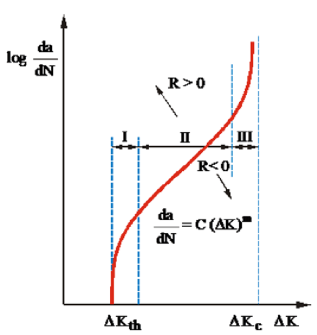When studying fatigue of materials using fracture mechanics, it is assumed that there is an initial crack or that the period of its formation is short or negligible. Determining the working life of a structure is reduced to predicting the time of crack growth. The process of material fatigue under variable loading can be divided into three phases (Zerbst et al, 2015), as in Figure 1: