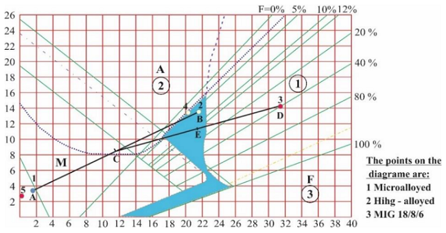 The choice of a filler material is directly related to the need for the desired chemical composition. Then the composition of the filler material corresponds to the chemical composition of one of the base materials or the average chemical composition. For bonding high-alloy steel with some other less alloyed or unalloyed steel, a high-alloy filler material should be used, as shown by the position of the filler metal in Figure 2 of the Schaeffler diagram (Bukvić et al, 2022).