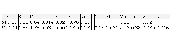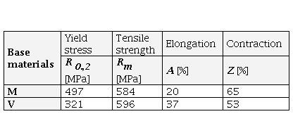Two base materials were used for welding: microalloyed steel S500NL1, under the commercial name NIOMOL 490K with a thickness of 16 mm (marked with M) and high-alloyed steel X6CrNiMoTi 17 12 2 according to EN 10088 (Č.4574 according to SRPS EN 10088-1) with a thickness of 12 mm (marked with V) (Bukvić, 2012). Table 1 shows the chemical compositions and Table 2 shows the mechanical properties of the base materials.