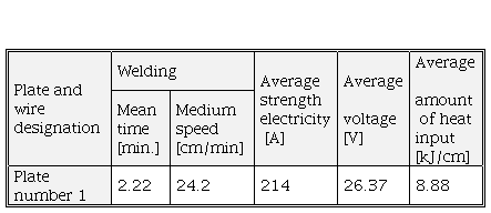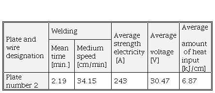 Experimental plates 1 and 2 were welded with the highest and lowest allowed amount of heat input. It is noted that the difference in heat input is about 30%. The obtained values of the quantity of input heat represent, in this case, the limit values for the chosen welding procedure and the filler material.
