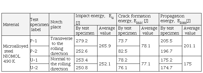 In testing microalloyed steel toughness at room temperature, it was observed that high values of total energy were obtained regardless of the direction in which either the test specimens or the notches were cut (transverse or normal to the rolling direction). The total impact energy is 5.3% lower for the test specimens cut transversely to the rolling direction and with their notch normal to the rolling direction. From the obtained results, the energies of crack propagation are higher than the energies of formation, which indicates the fact that the examined material is ductile.
