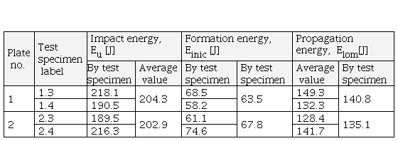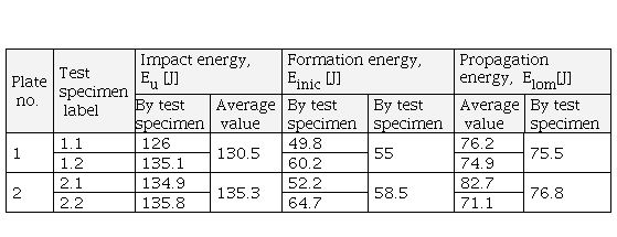 Plate 2 has a slightly higher crack formation energy of 58.5 J, and the lower crack formation energy of the test specimen from plate number 1 is 55 J. The difference is not significant.