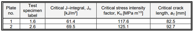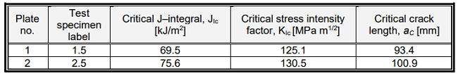 The obtained critical crack lengths are adequate to the obtained KIc values, so the highest value is obtained by plate 2 while plate 1 has a lower value by 11%.