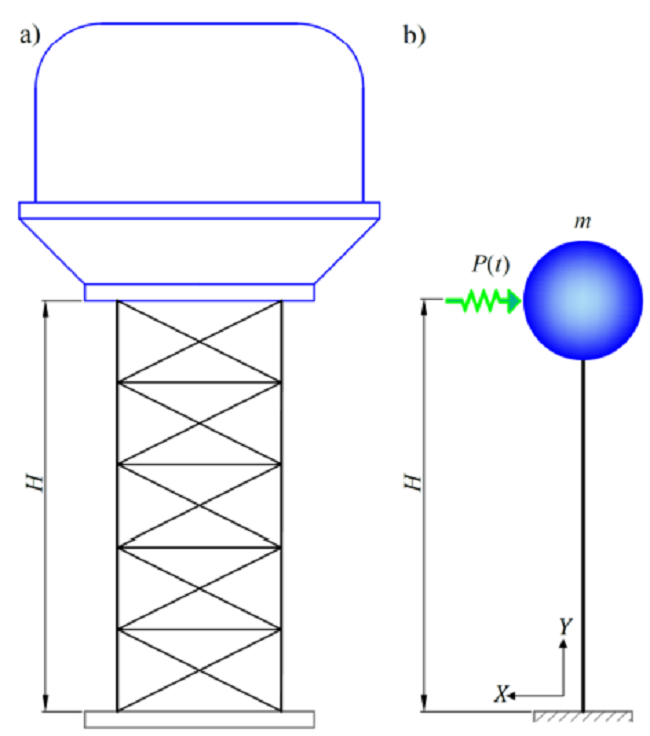The physical representation and the discrete model with the single degree of freedom (SDOF') of the steel water tank are shown in Figure 5.