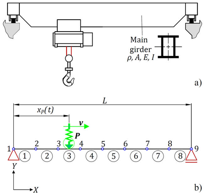 Слика 8 – а) Скица мосне дизалице, б) завршноелементни модел са помичним оптерећењем мосне дизалице