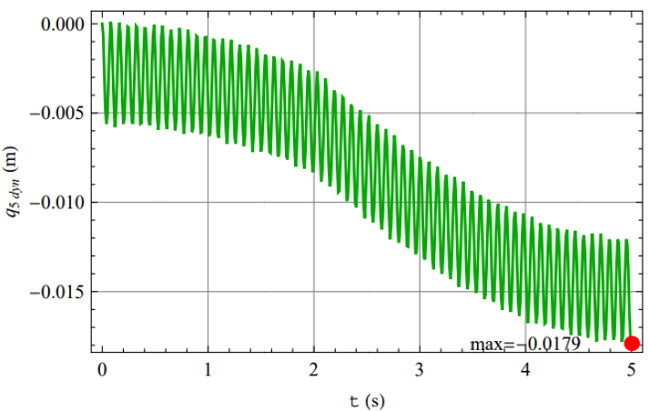 The result in the form of a diagram of the displacement of node 5 of the main girder of the bridge crane during the moving of the trolley from the end left position to the middle of the bridge is shown in Figure 9.