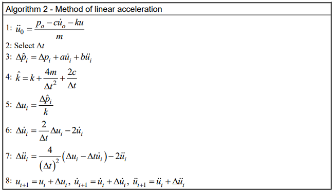 The linear acceleration method is one of the most well-known stepby-step integration methods. This method gives excellent results with relatively little effort in computation. Its main characteristics are: the acceleration changes linearly during the interval, the damping and stiffness coefficients of the system remain constant during the time interval, the accuracy of the method depends on the size of the selected time step, and sudden changes of the stiffness and damping function must be taken into account. It is very good for small Δt, while it is unstable for large Δt. A detailed description of this method is given in (Bathe, 2014; Wilson, 2001). The procedure of the linear acceleration method is shown in the form of Algorithm 2: