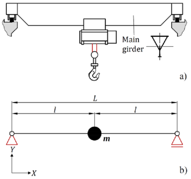 Слика 1 – а) Скица мосне дизалице, б) модел са концентрисаном масом мосне дизалице