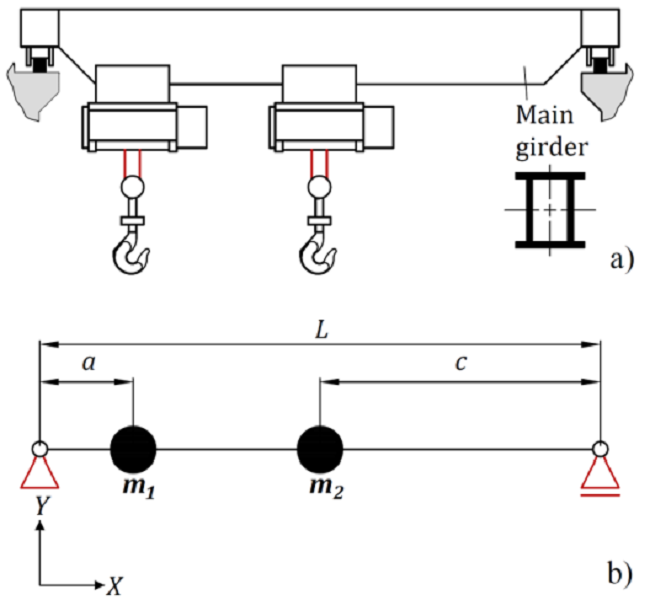 Слика 3 – а) Скица мосне дизалице са два витла, б) модел са концентрисаним масама носеће конструкције мосне дизалице