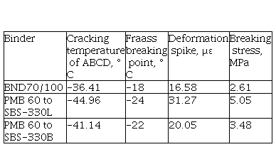 Table 2 shows the low-temperature values determined by the ABCD method for several binders, including SBS-polymer-based PMBs of different structures.