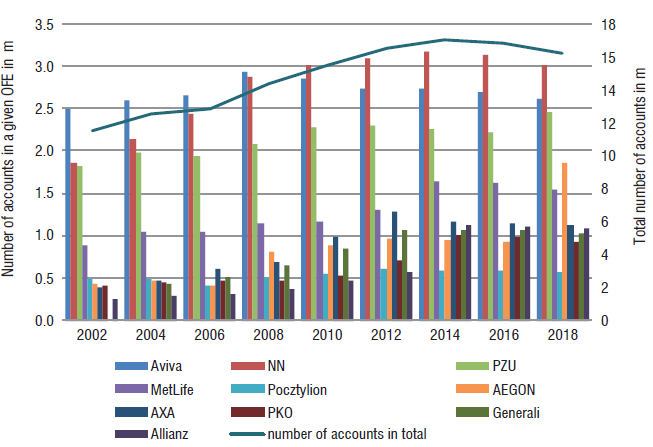 Until 2014 there had been a steady growth in the number of accounts in OFEs from 11.5 million to 17 million (i.e., by 49%). Taking into account biyearly changes, the highest increase of 12% was recorded in 2008 (compared to 2006). Later on (2016 and 2018), the number of accounts fell (to 16.2 million in 2018), which resulted from amendments in the legislation.