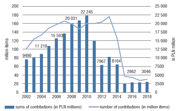 In Figure 4 depicting aggregated data for sums and the number of contributions, one should notice a clear upward trend in the sums of transferred contributions until 2010. In total, in the year 2010, 22.2 million zlotys (PLN) was transferred to OFEs. In 2011 there was a drop of 33%. The most considerable decline of 89% in comparison to 2010 took place in 2015. After that year, the funds noted a slow growth in the following years. The highest number of contributions was handed over in 2013 (175.9 million), and the lowest one in 2017 (27.6 million).