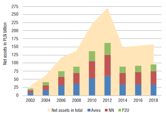 The decline after 2011 resulted mainly from a change in the level of contributions. Also, from July 2014, OFEs received contributions only from members who signed suitable declarations; in addition, from February 2014, “security slide” regulations took effect. For the first time resources under security, slide regulations were handed over in the last quarter of 2014 (for the period starting in February of that year) in the total amount of PLN 3.7 bn (i.e., 2.3% of OFEs’ net assets, as of September 2014). In turn, lowering the retirement age in 2017 immediately produced a group of pensioners and applying a “security slide” to additional younger members (KNF(b), 2014: 19; 2017: 19, 20, 21). A more detailed analysis of data from the KNF(a) discloses that the leading position in terms of the sums of contributions transferred was taken by Aviva, NN, and PZU, whose share in 2002 and 2018 amounted to 29% and 19%, 21% and 29%; 14% and 12%, respectively.