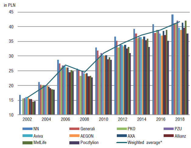 own work based on data from the KNF.In Figure 6, one can see the VAU at the end of each year under scrutiny for funds operating in 2018 and the weighted average for all OFEs operating in a given year. In each year in question, the highest end-of-year value of VAU was achieved by NN. One needs to note an upward trend for VAU in respective OFEs (a decrease was noticeable only in 2008). In December 2018, the weighted average for VAU stood at PLN 41.74, which was 163% higher than in 2002. In that month, the highest VAU was achieved by NN at PLN 44.19, and the lowest by Pocztylion – PLN 37.67.