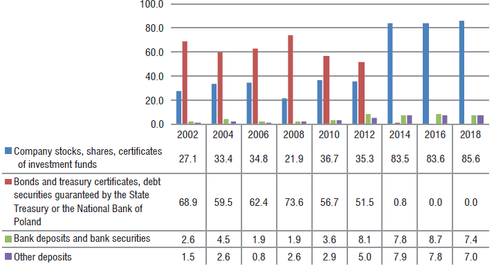 The 1997 Act clearly defined the allocation of pension funds’ assets, indicating the categories of deposits, their levels, and limits. In effect, funds were obliged to invest mainly in so-called safe securities (e.g., bonds and other debt securities guaranteed by the State Treasury or the National Bank of Poland). Investing money in more risky securities, i.e., stocks and shares, was restricted by law (Act of 1997, art. 139–156; Zimny, 2011: 175). The above-mentioned arrangements secured safety but at the same time affected profitability (more in: Czechowska, 2002: 51).